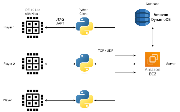 Developed a multiplayer online game equivalent slither.io, but controlled via FPGA, made over 4 weeks in a team of 6. Game is written in python enabled using pygame. Client communicates with server through TCP using protobuf to optimise communication. To communicate with the FPGA JTAG and NIOS II were used, providing the required duplex communication. We then developed our own hardware to properly make use of the DE10-Lite FPGA. Our server also houses a DynamoDB database to store key player information, such as highscores.